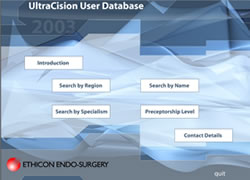 Case studyClient - Johnson & Johnson - Ethicon Endo Surgery The Marketing team of Ethicon Endo Surgery have a database that contains vital product knowledge from end users. The objective was to share the knowledge in the database at regular intervals, and create a regular bi-monthly multimedia newsletter to highlight information and news. Triangle Media created a solution that allowed the database to be "published" to CDROM in a read only format. Although the database was in particular format, the software on the CDROM made it possible to view the database without any specific software requirements. Additional functions, such as tailored report printing and interactive map searches made the CDROM a truly interactive experience. The newsletter was created to be a self contained multimedia EXE file complete with audio features. The file was small enough (under 1MB) to be emailed to whole team on a regular basis. |